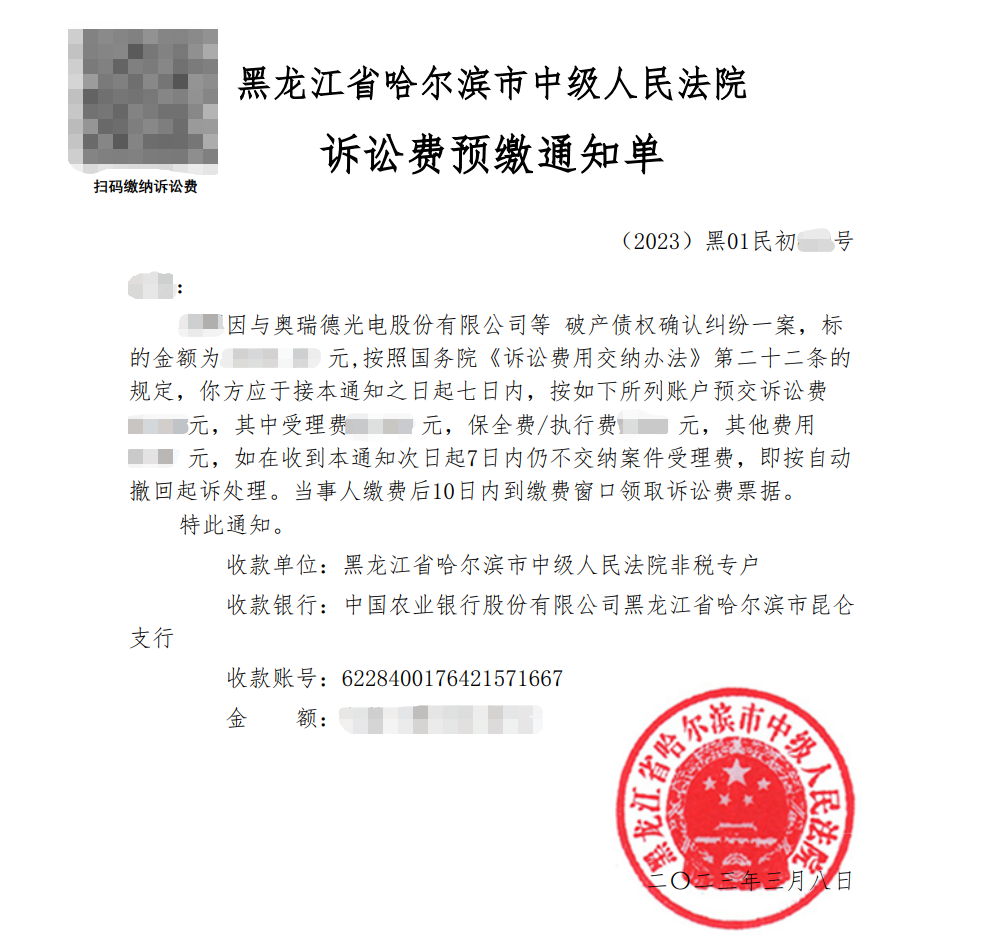 奥瑞德(600666)原告投资者诉被告奥瑞德光电股份有限公司证券虚假陈述责任纠纷一案,一审案件,逐批次推进中,投资者诉讼 220 份一审判决赔偿金额 26,592,516.5 元。哈尔滨市中级人民法院于2022年11月29日下达民事裁定书,受理了奥瑞